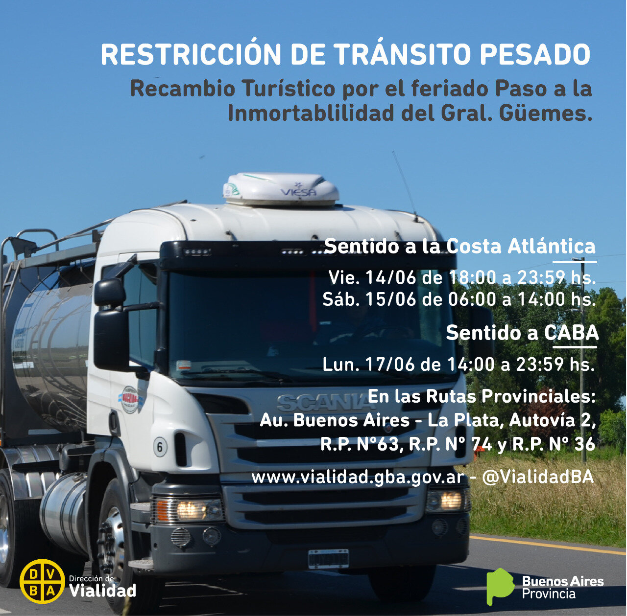 La Dirección de Vialidad de la Provincia de Buenos Aires, dependiente del Ministerio de Infraestructura y Servicios Públicos, comunica que por el feriado que conmemora el fallecimiento del general Martín Miguel de Güemes, los días 14,15 y 17 de junio de 2019, se restringirá la circulación de camiones con carga de más de 7 (siete) toneladas de porte bruto en: la Autovía 2, Rutas Provinciales 11, 36, 56, 63, 74, y Autopista Buenos Aires–La Plata, con el objetivo de facilitar el desplazamiento vehicular y prevenir siniestros de tránsito en rutas turísticas.