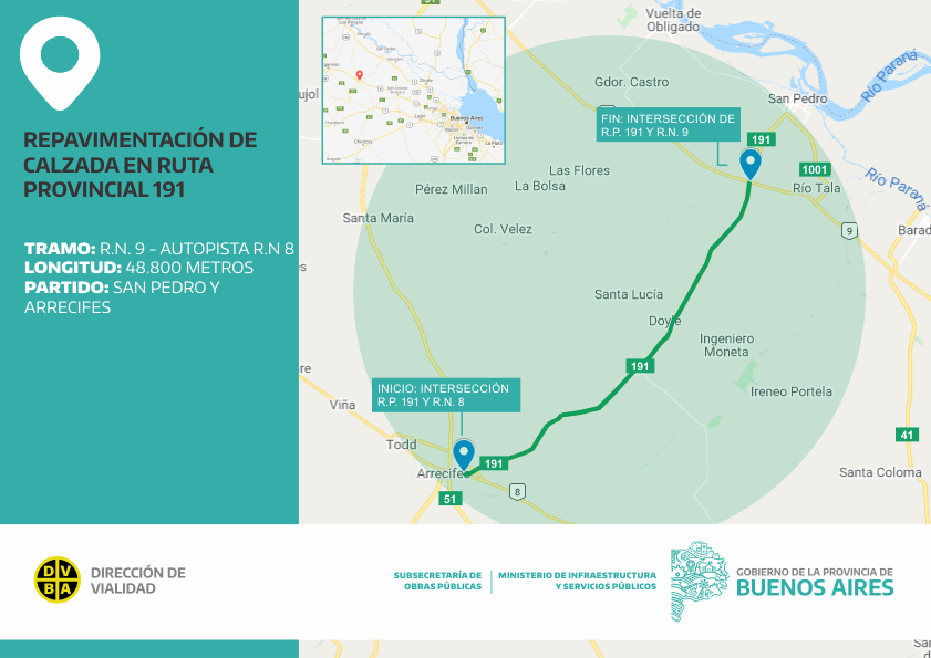 La Dirección de Vialidad de la Provincia de Buenos Aires, dependiente de la Subsecretaría de Obras Públicas, licitó la obra de repavimentación de la Ruta 191, en el tramo que inicia en la intersección con la Ruta Nacional 9 y que finaliza en el empalme con la Autopista de la Ruta Nacional 8.