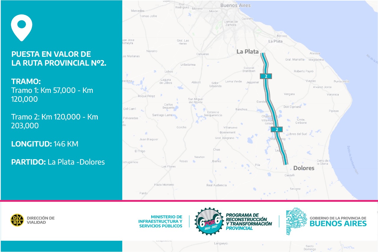 La Dirección de Vialidad de la Provincia de Buenos Aires, dependiente del Ministerio de Infraestructura y Servicios Públicos, licitó la obra “Puesta en valor de la Ruta Provincial N° 2”, a ejecutarse entre los partidos de La Plata y Dolores.