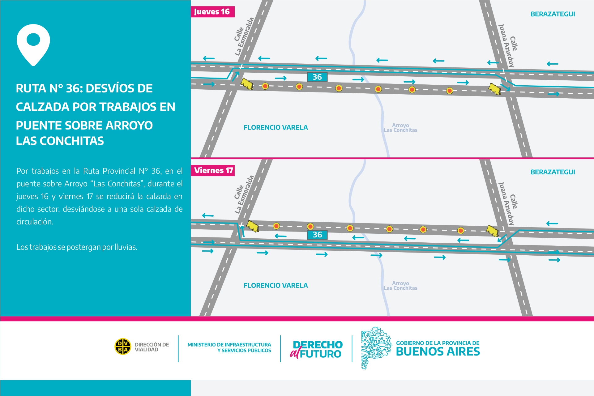 La Dirección de Vialidad de la provincia de Buenos Aires, comunica que por trabajos en la Ruta Provincial N°36, en el puente sobre A° Las Conchitas, durante el jueves 16 y viernes 17 se reducirá la calzada en dicho sector, desviándose a una sola calzada de circulación.