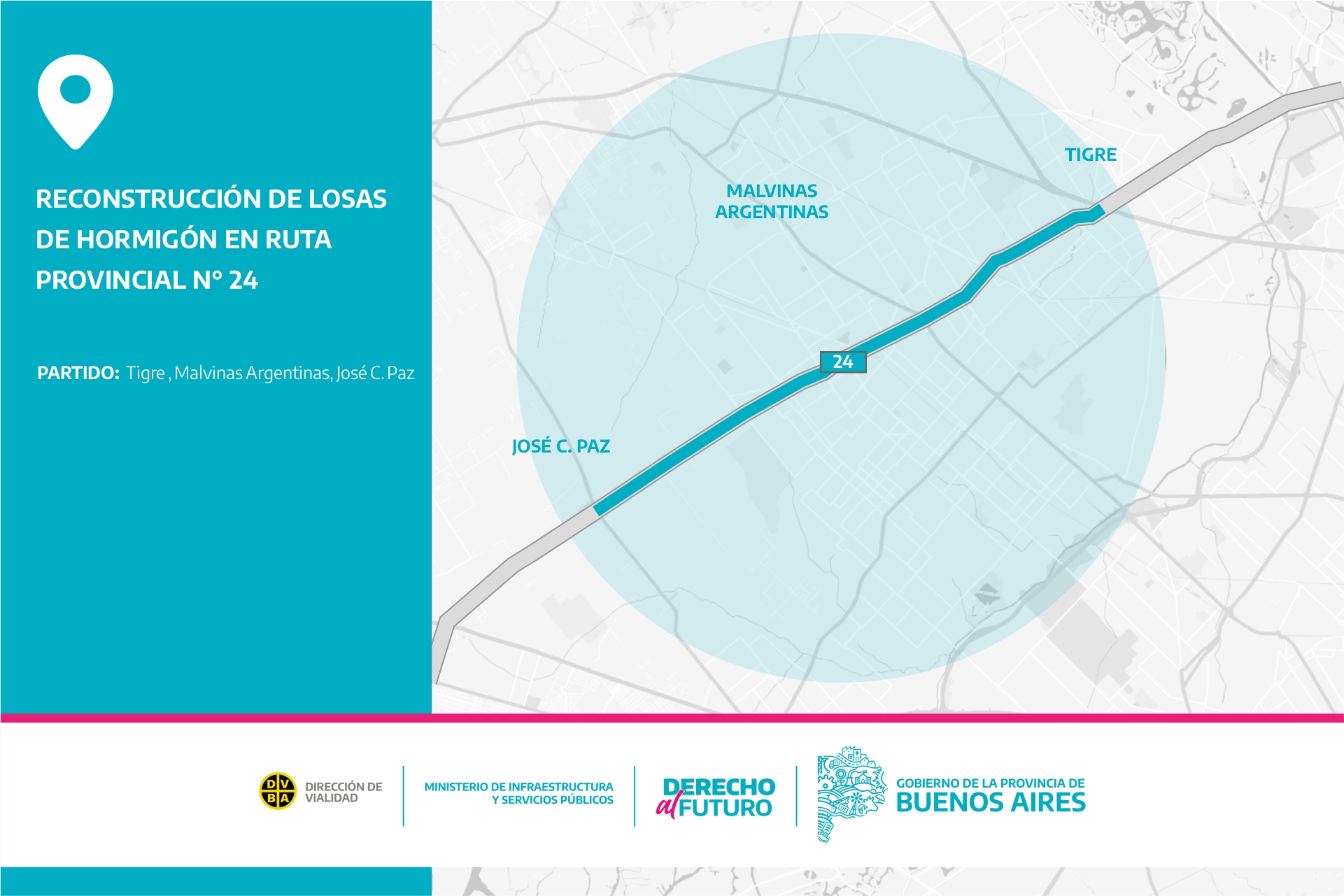 La Dirección de Vialidad de la Provincia de Buenos Aires, dependiente del Ministerio de Infraestructura y Servicios Públicos, licitó la obra de reconstrucción de losas de hormigón en la Ruta Provincial Nº24, en los partidos de Malvinas Argentinas, Tigre y José C. Paz.