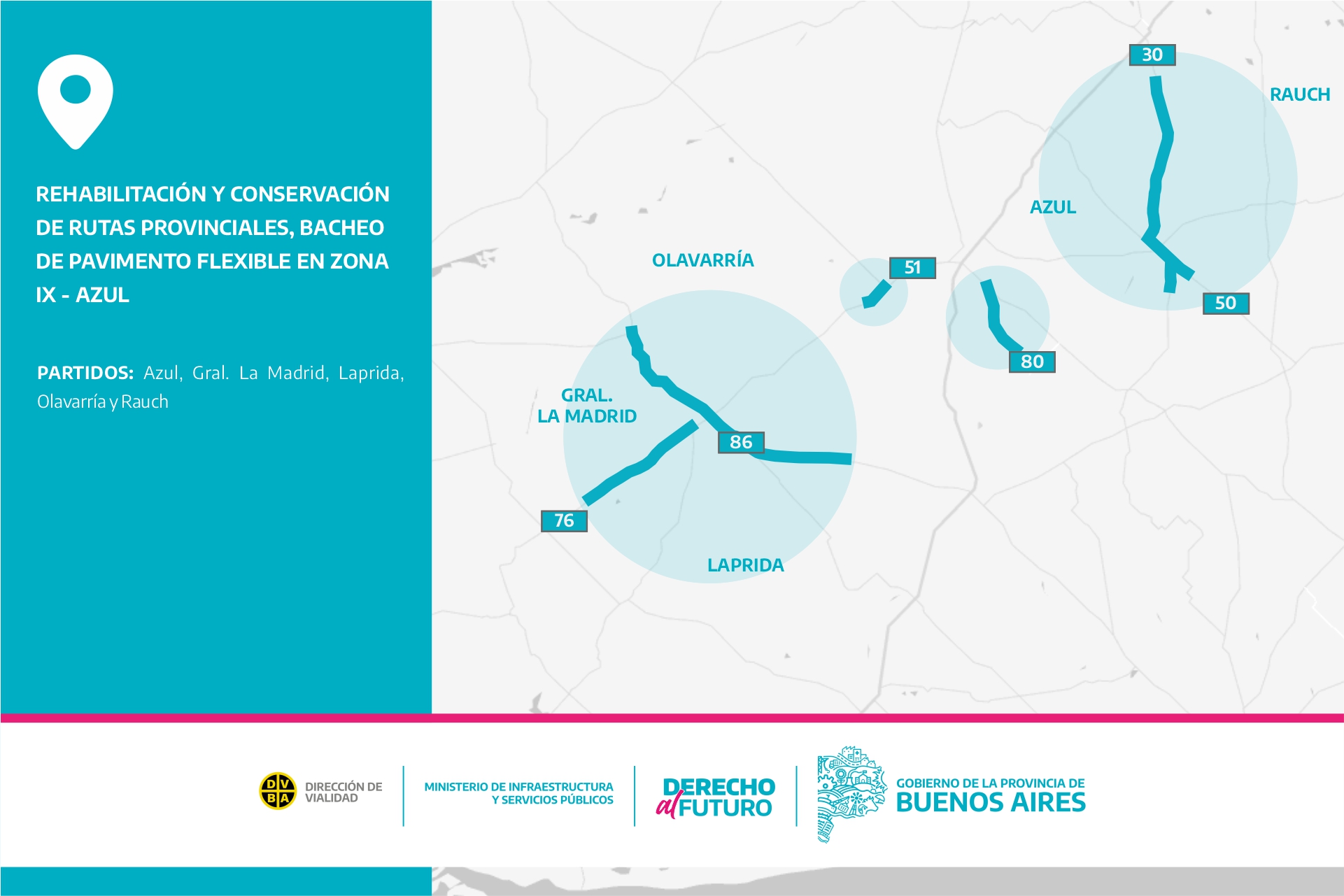 Se trata de la obra de Bacheo de Pavimento Flexible en los partidos de Azul, General Lamadrid, Laprida, Olavarría y Rauch.