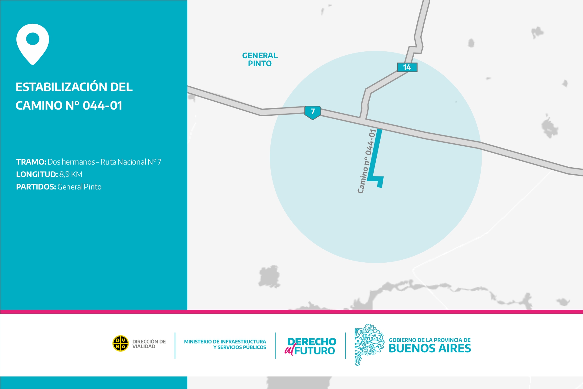 Se trata de la obra de Estabilización del Camino 044-01, en el tramo que inicia en los Dos Hermanos y culmina en la Ruta Nacional Nº 7, con una longitud de 9,8 kilómetros.