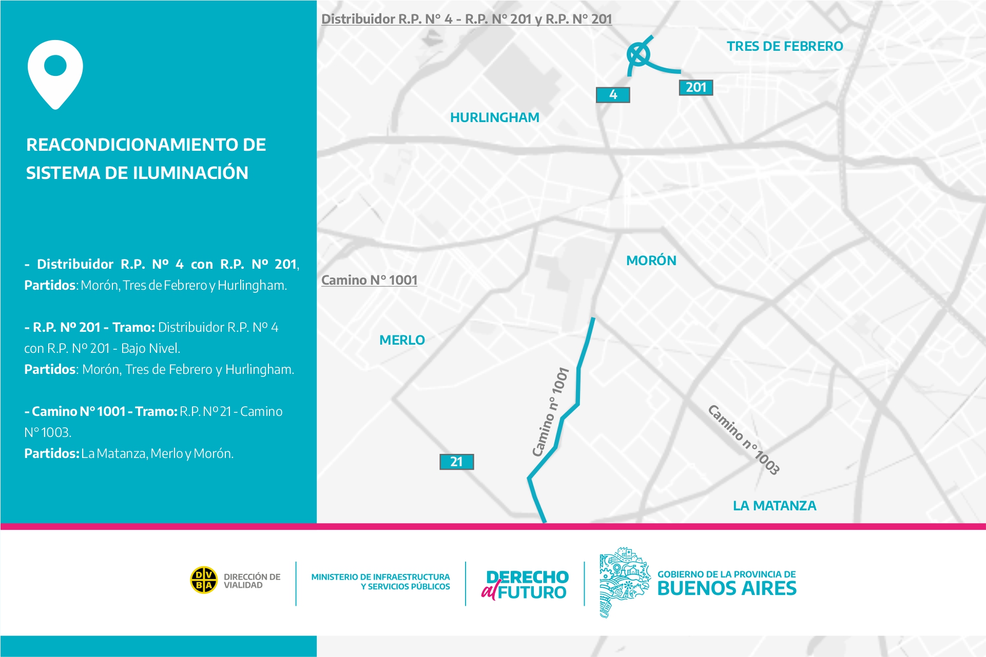A su vez, se intervendrá el Camino Nº 1001, en el tramo comprendido entre la Ruta Provincial Nº 21 y el Camino Nº 1003, en los partidos de La Matanza, Merlo y Morón.