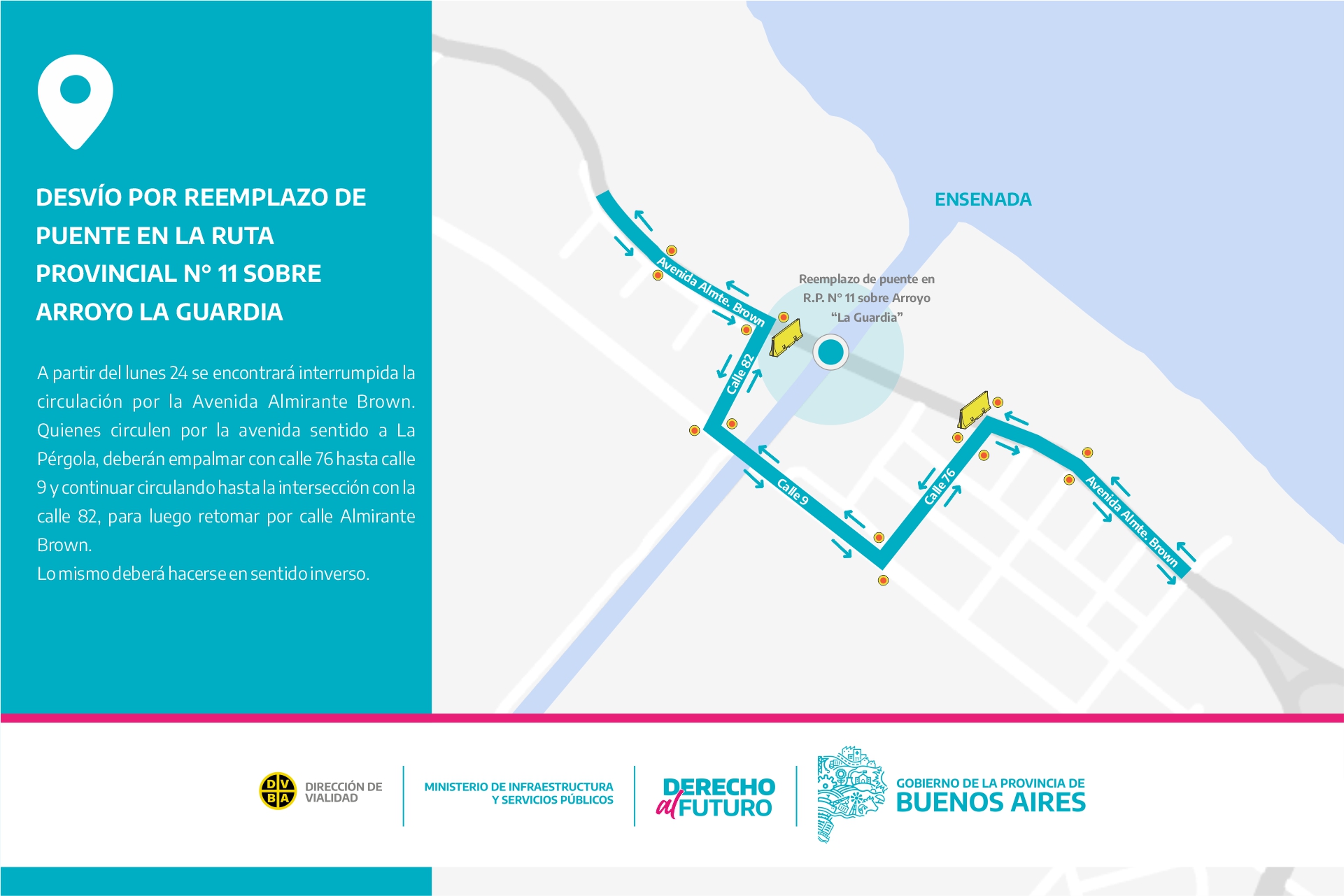 La Dirección de Vialidad de la Provincia de Buenos Aires, dependiente del Ministerio de Infraestructura y Servicios Públicos, comunica que debido a las obras que se desarrollan en el Puente sobre el Arroyo La Guardia, en la localidad de Ensenada, a partir del lunes 24 se encontrará interrumpida la circulación por la Avenida Almirante Brown.
