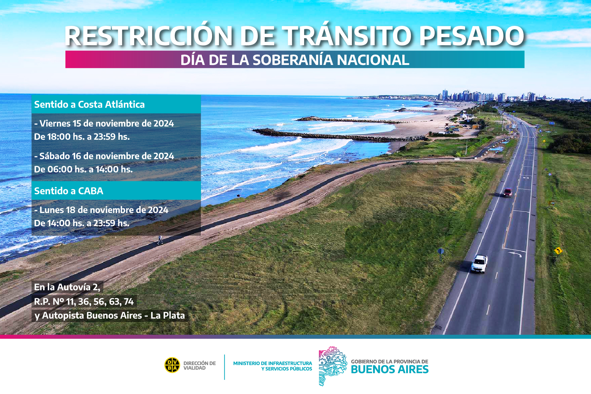 La Dirección de Vialidad de la Provincia de Buenos Aires, dependiente del Ministerio de Infraestructura y Servicios Públicos, comunica que, debido al feriado turístico por el Día de la Soberanía, los días viernes 15 y sábado 16 de noviembre se restringirá la circulación de camiones con carga de más de 7 (siete) toneladas de porte bruto en la Autovía 2, las Rutas Provinciales Nº11, Nº36, Nº56, Nº63, Nº74, y la Autopista Buenos Aires–La Plata, con el objetivo de facilitar el desplazamiento vehicular y prevenir siniestros de tránsito en rutas turísticas.