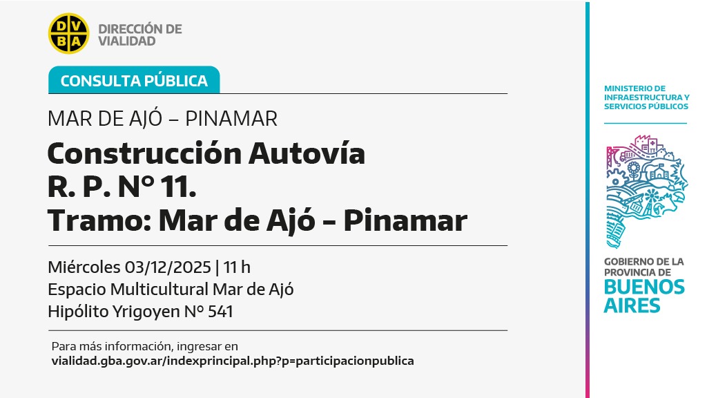 Con el objetivo de informar sobre los detalles técnicos del proyecto “Construcción Autovía R. P. N° 11, Tramo: Mar de Ajó – Pinamar”, la Dirección de Vialidad de la provincia de Buenos Aires, dependiente del Ministerio de Infraestructura y Servicios Públicos, llama a una Consulta Pública, a realizarse el miércoles 3 de diciembre de 2025 a las 11:00 hs en el Espacio Multicultural Mar de Ajó, ubicado en Hipólito Yrigoyen 541 de dicha localidad.