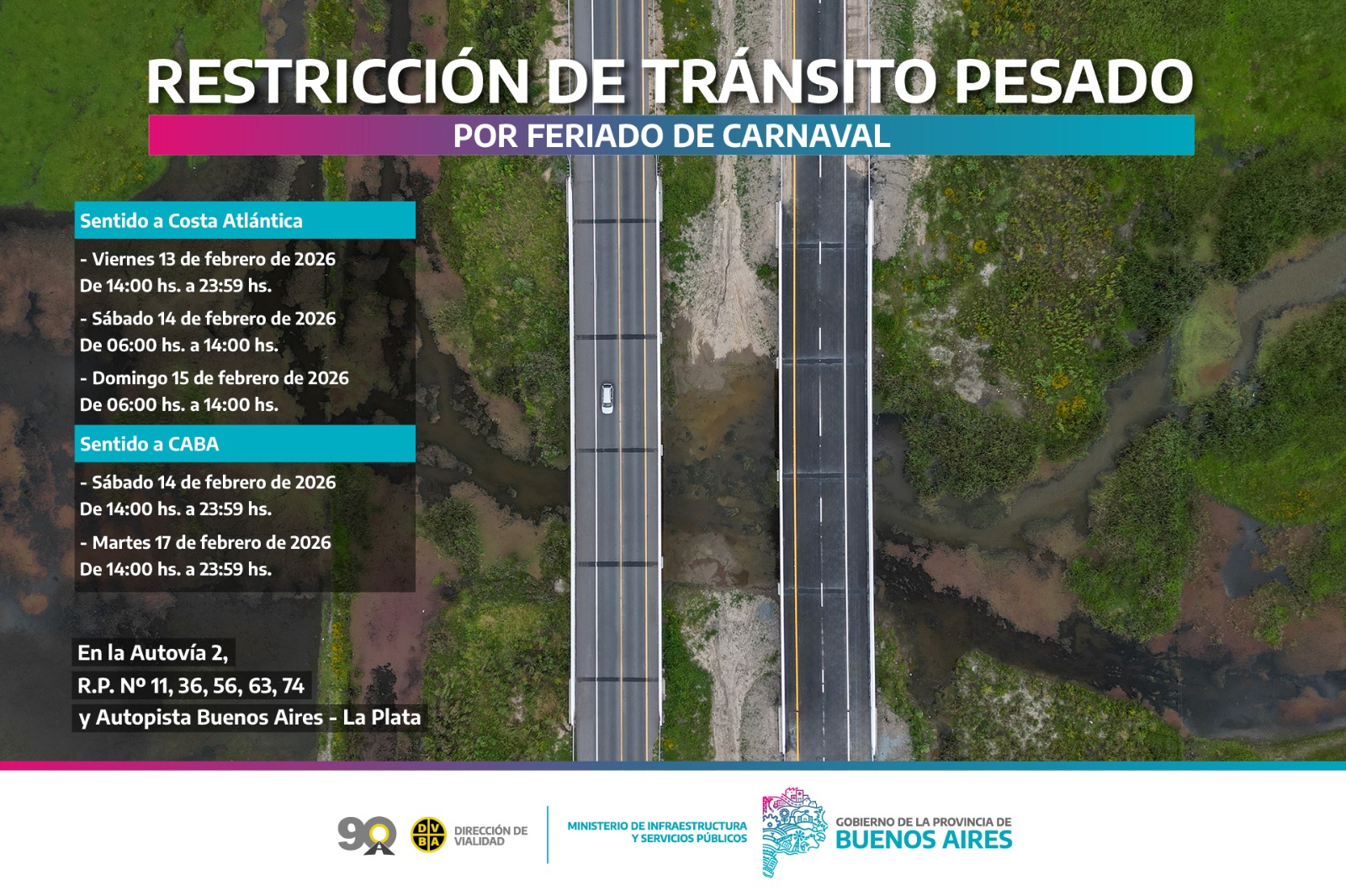 La Dirección de Vialidad de la Provincia de Buenos Aires, dependiente del Ministerio de Infraestructura y Servicios Públicos, comunica que -debido al feriado de carnaval - los días viernes 13, sábado 14, domingo 15 y martes 17 de febrero de 2026- se restringirá la circulación de camiones con carga de más de 7 (siete) toneladas de porte bruto en la Autovía 2, las Rutas Provinciales Nº11, Nº36, Nº56, Nº63, Nº74, y la Autopista Buenos Aires–La Plata, con el objetivo de facilitar el desplazamiento vehicular y prevenir siniestros de tránsito en rutas turísticas.