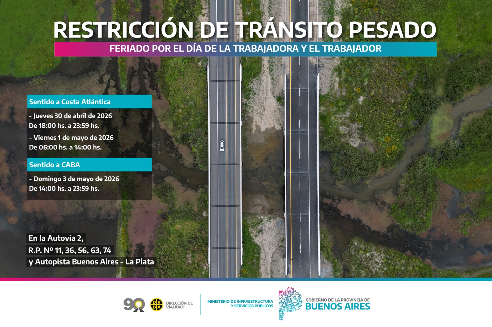 La Dirección de Vialidad de la Provincia de Buenos Aires, dependiente del Ministerio de Infraestructura y Servicios Públicos, comunica que, debido al Feriado por el Día del Trabajador, los días jueves 30 de abril, viernes 1 de mayo y domingo 3 de mayo del 2026, se restringirá la circulación de camiones con carga de más de 7 (siete) toneladas de porte bruto en la Autovía 2, las Rutas Provinciales Nº11, Nº36, Nº56, Nº63, Nº74, y la Autopista Buenos Aires–La Plata, con el objetivo de facilitar el desplazamiento vehicular y prevenir siniestros de tránsito en rutas turísticas.