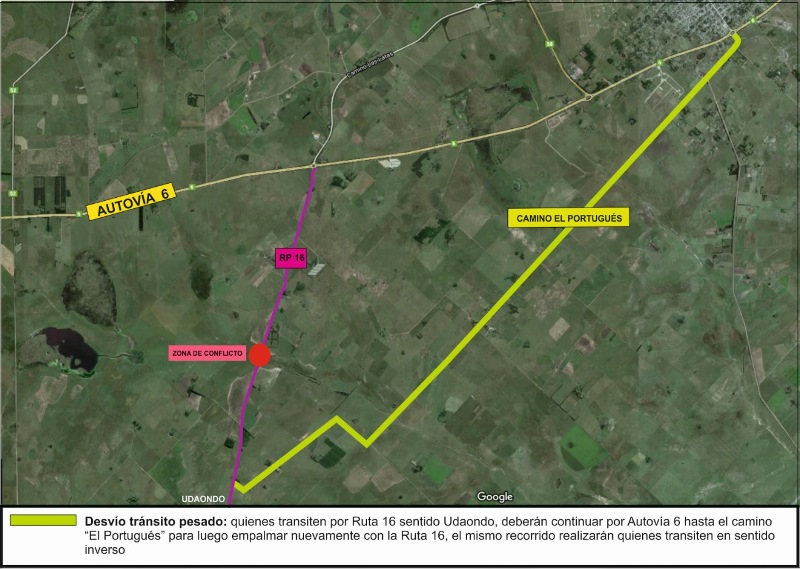 Por tal motivo, quienes transiten por Ruta 16 sentido Udaondo, deberán continuar por Autovía 6 hasta el camino municipal “El Portugués” para luego empalmar nuevamente con la Ruta 16, el mismo recorrido realizarán quienes transiten en sentido inverso.