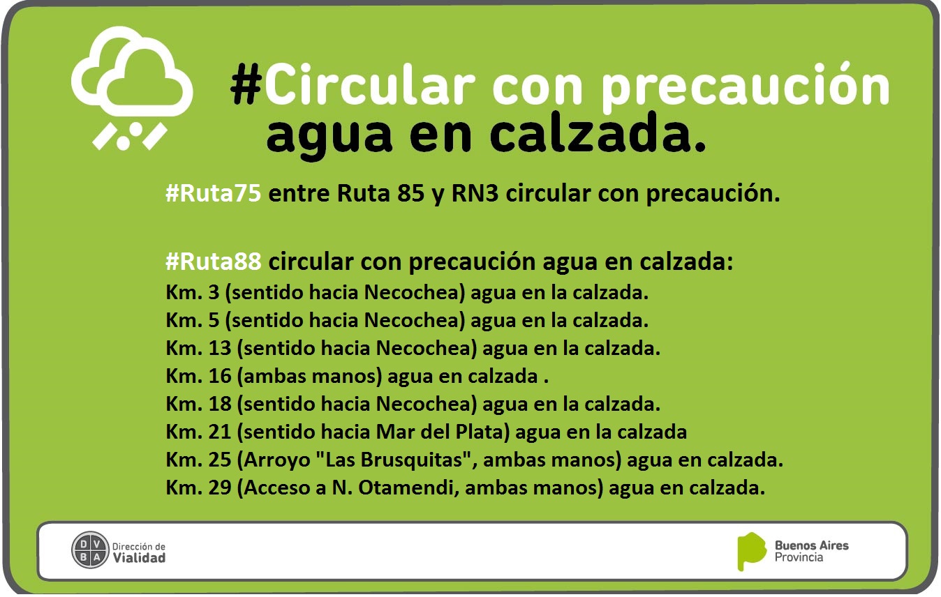La Dirección de Vialidad de la provincia de Buenos Aires, comunica que debido a las lluvias que están afectando gran parte del territorio provincial se deberá circular con precaución en la Ruta 75, entre Ruta 85 y Ruta Nacional 3 por presencia de agua en calzada. Asimismo se solicita circular con precaucón en la Ruta 88 entre Mar del Plata y Necochea por presencia de agua en calzada en disntintos kilómetros.