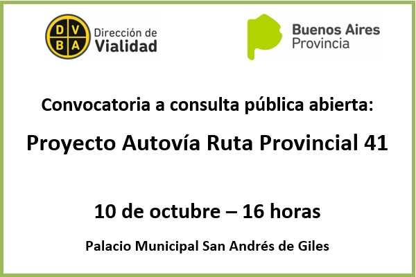 Con el objetivo de informar sobre los estudios técnicos del proyecto Autovía Ruta Provincial 41 en el tramo San Antonio de Areco - San Andrés de Giles, la Dirección de Vialidad de la provincia de Buenos Aires, dependiente del Ministerio de Infraestructura y Servicios Públicos, llama a una consulta pública abierta, a realizarse el próximo 10 de octubre a las 16 horas, en el palacio Municipal de San Andrés de Giles, ubicado en la calle Moreno 338.