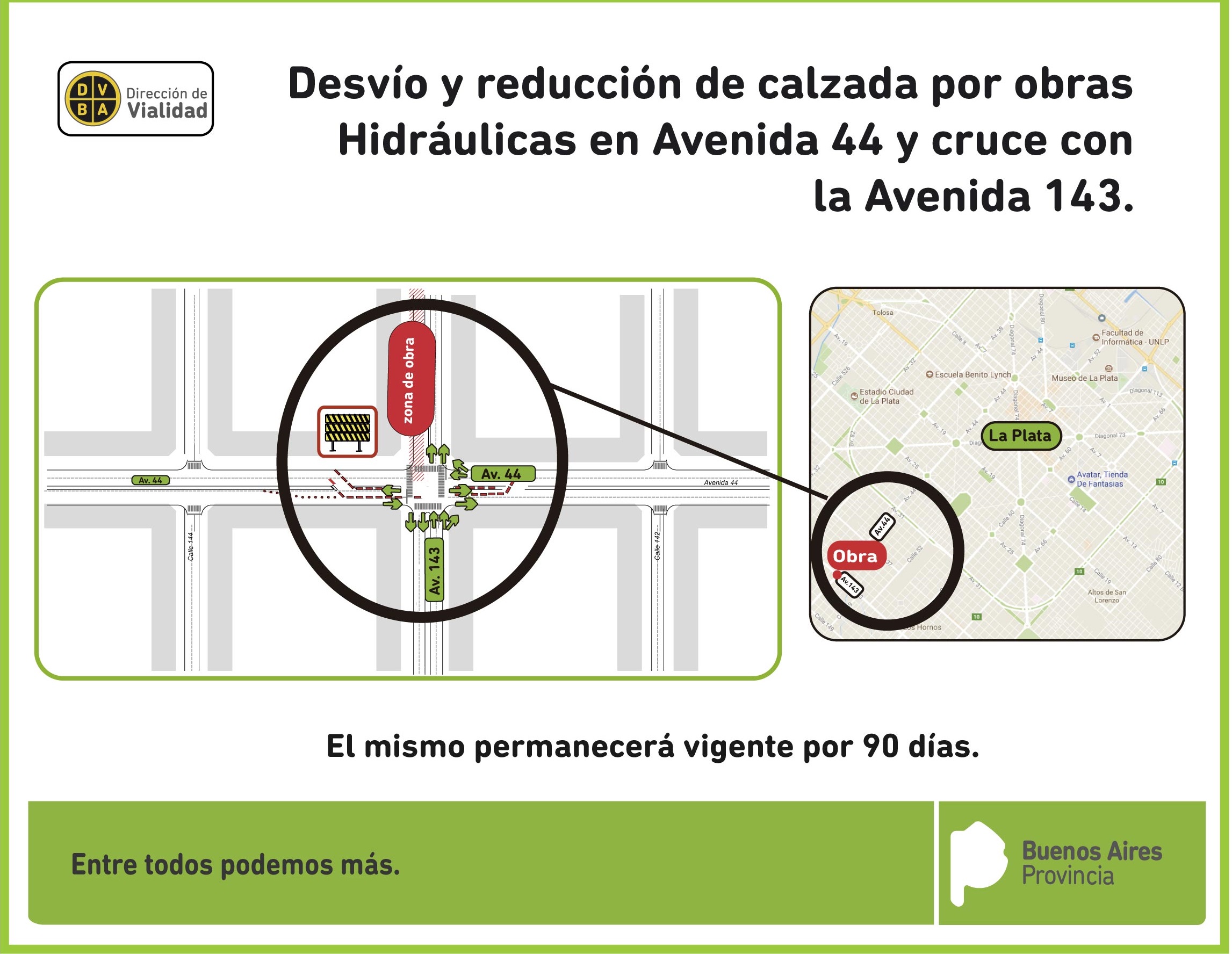 La Dirección de Vialidad de la provincia de Buenos Aires, dependiente del Ministerio de Infraestructura y Servicios Públicos, comunica que por la ejecución de obras hidráulicas, a partir de hoy y por 90 días se realizarán desvíos y reducción de calzada en el cruce de la Avenida 44 y Avenida 143.
