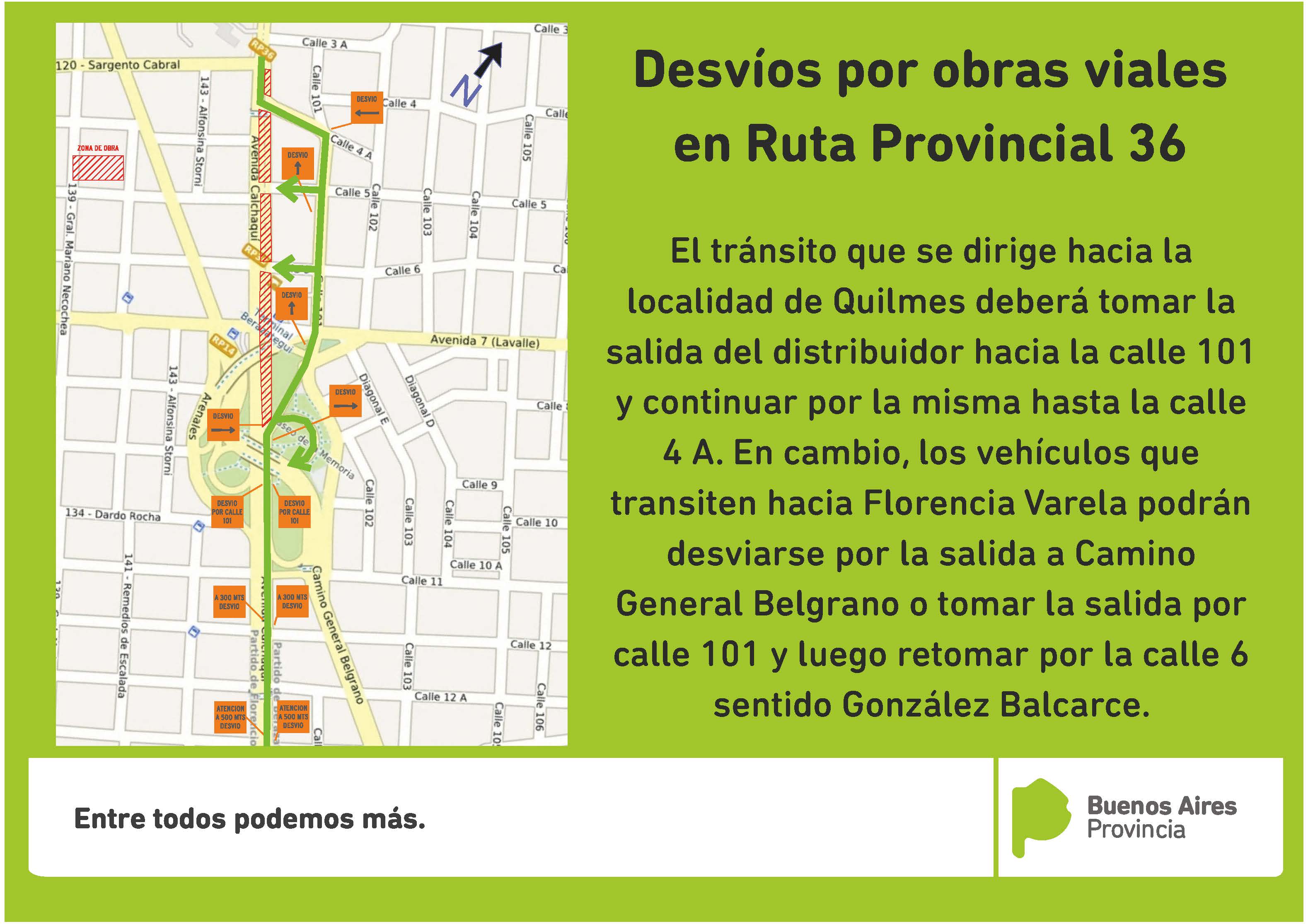 El Gobierno de la provincia de Buenos Aires, a través de la Dirección de Vialidad del Ministerio de Infraestructura y Servicios Públicos, avanza con los trabajos de repavimentación de la Ruta Provincial 36 entre los partidos de Florencio Varela y Berazategui. Debido a las obras viales se cerrará el tránsito en dicho corredor a la altura de la Avenida Hipólito Yrigoyen, desde hoy y por un período de tres meses.