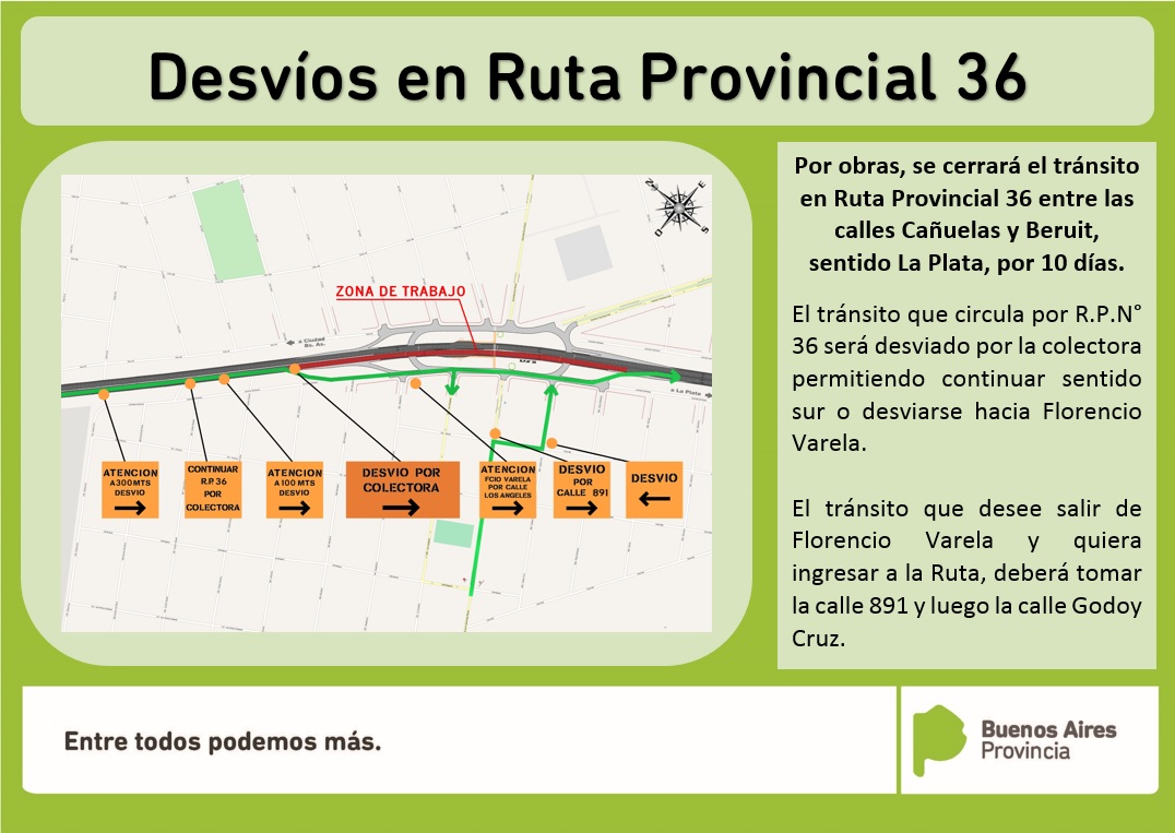 Por tal motivo, el tránsito que circula por Ruta Provincial 36 será desviado por la colectora permitiendo continuar sentido sur o desviarse hacia Florencio Varela. Mientras que el tránsito que desee salir de Florencio Varela y quiera ingresar a la Ruta, deberá tomar la calle 891 y luego la calle Godoy Cruz. Es importante señalar que todo cruce desde la Avenida Juan Domingo Perón y Eva Perón quedarán anulados.