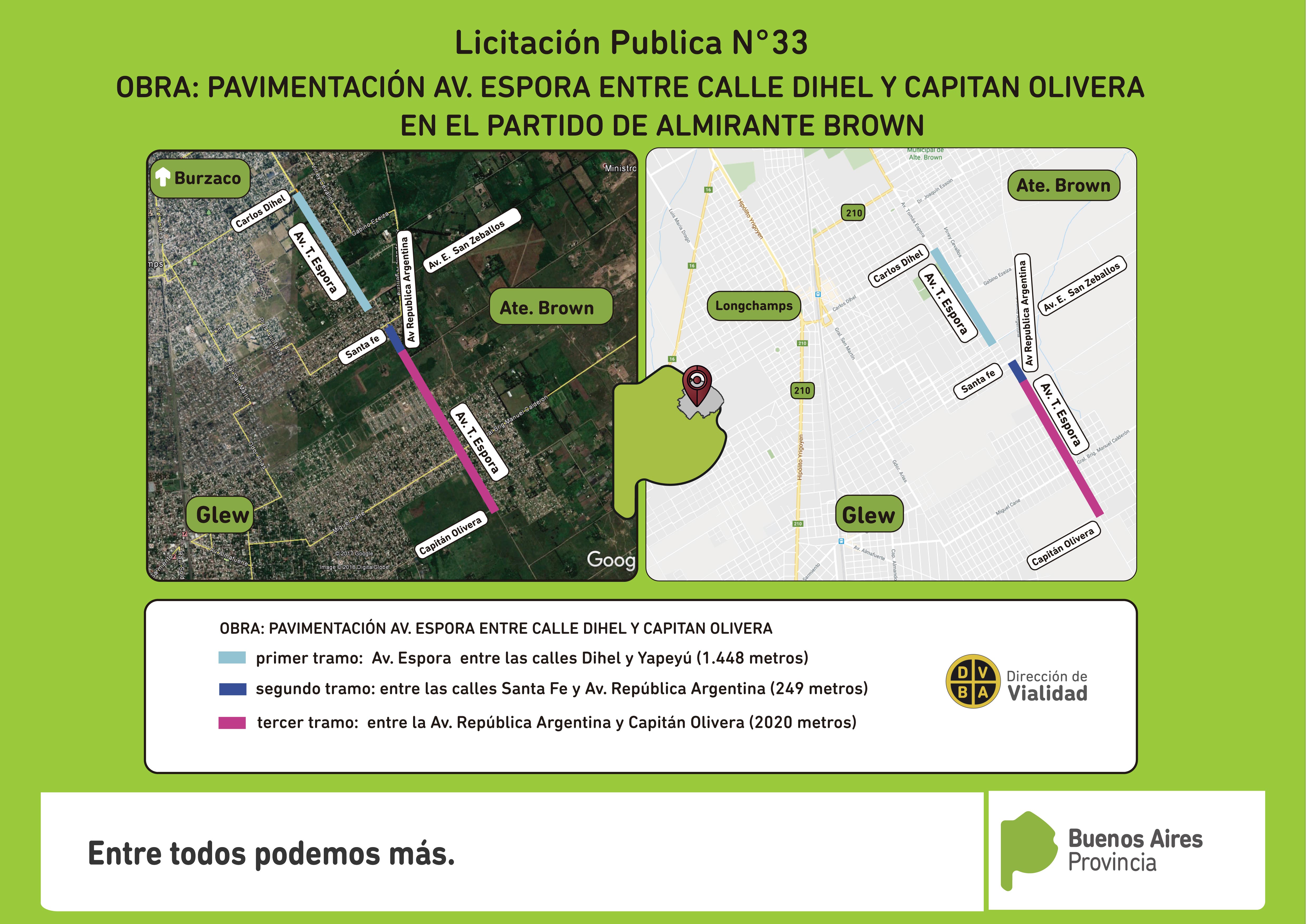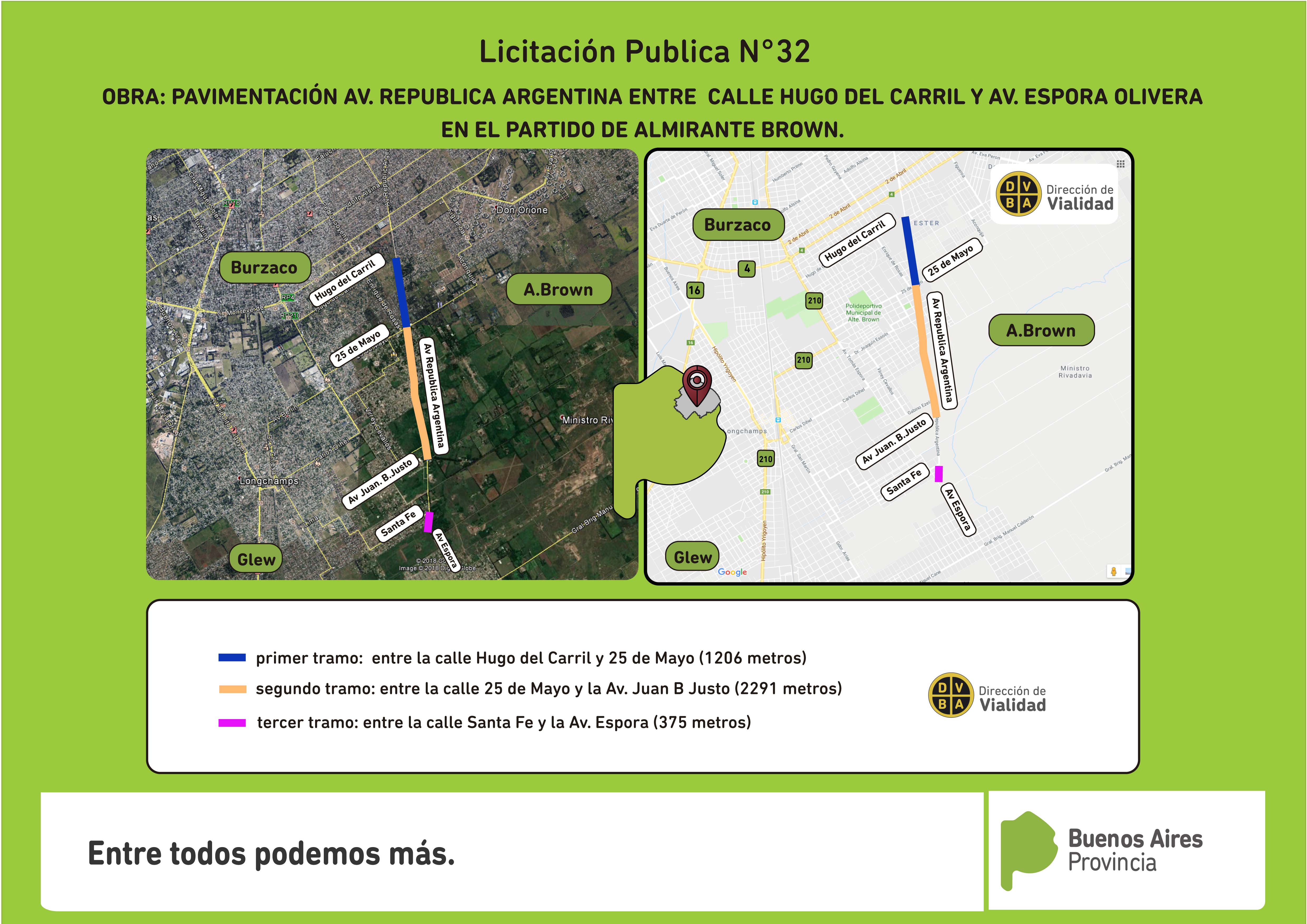 Los trabajos viales se realizarán en las localidades de Ministro Rivadavia, Longchamps y Glew. Las obras en la Avenida República Argentina serán entre las calles Hugo del Carril y Avenida Espora. El proyecto elaborado entre Vialidad y el Municipio de Almirante Brown, contempla la pavimentación en tres tramos: el primero, va desde la calle Hugo del Carril y 25 de Mayo (1206 metros), de doble calzada; el segundo tramo, se desarrolla entre la calle 25 de Mayo y la Avenida Juan B. Justo (2291 metros) en una calzada de hormigón simple; y el tercero, de 375 metros entre la calle Santa Fe y la Avenida Espora.